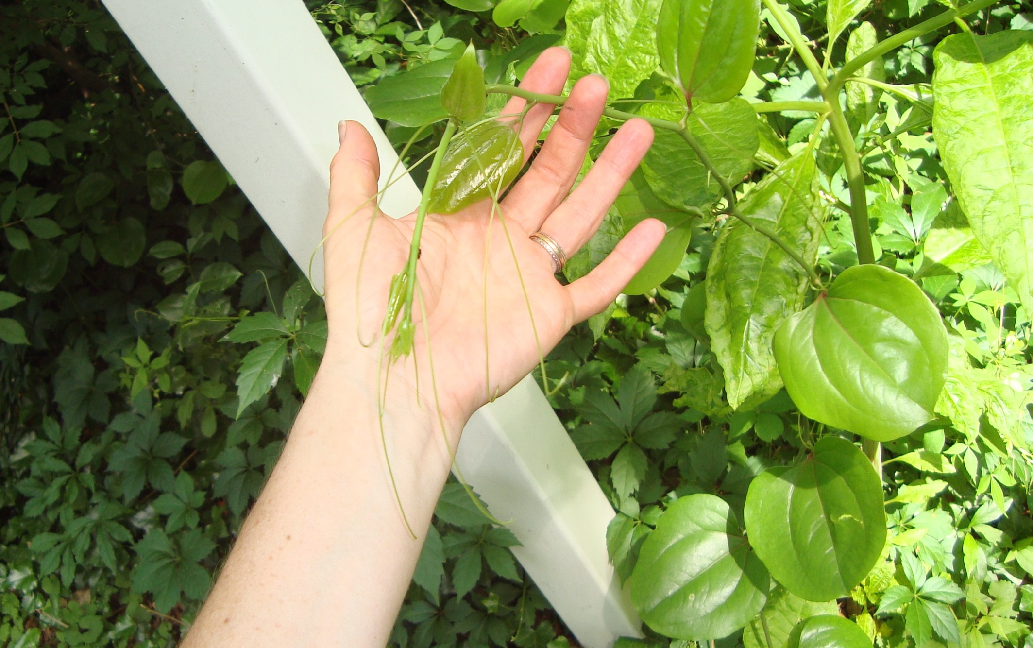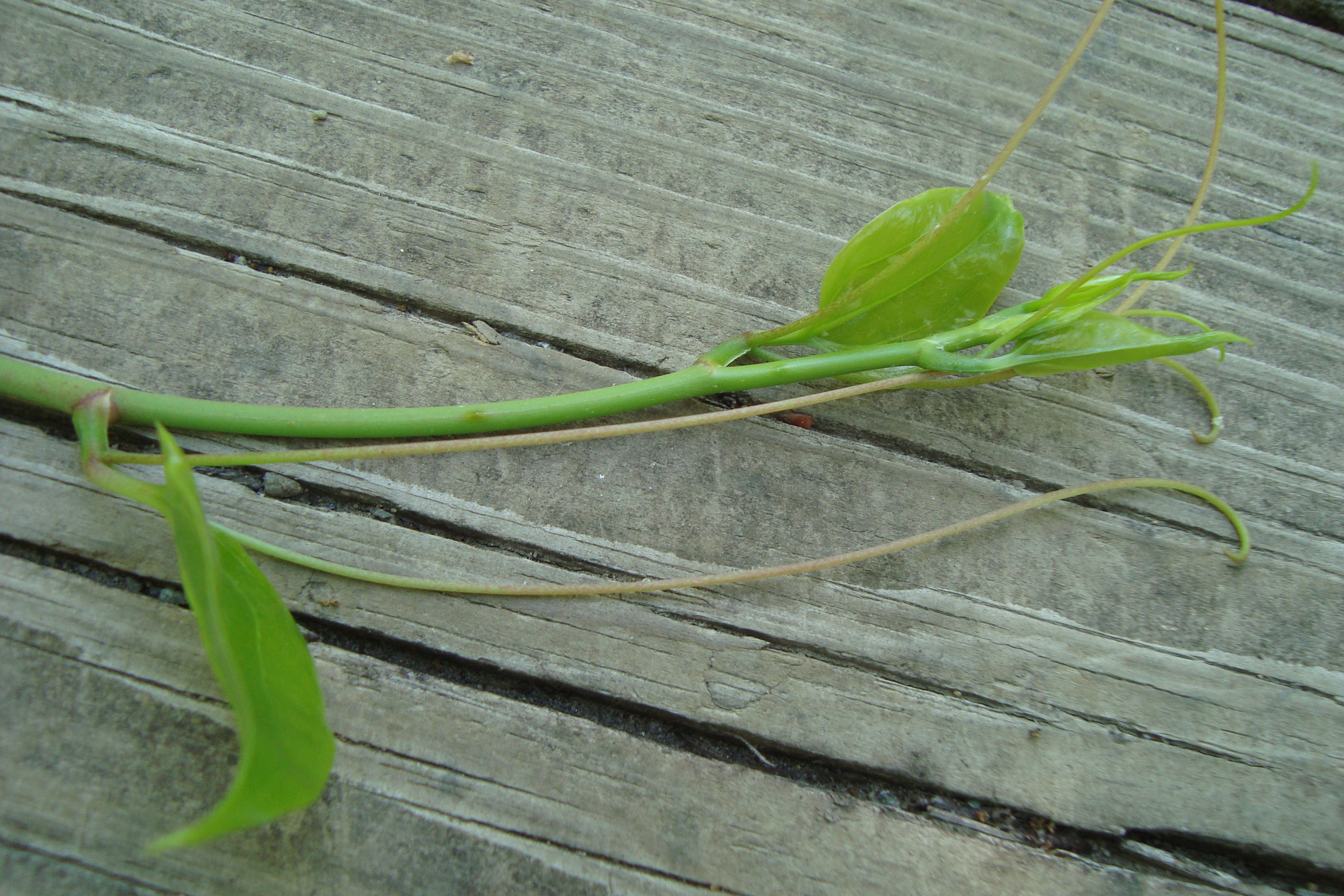 The vine has thorns, climbing tendrils, and shiny heart-shaped leaves with smooth edges. The leaves have 3-5 parallel veins which radiate out from the base.