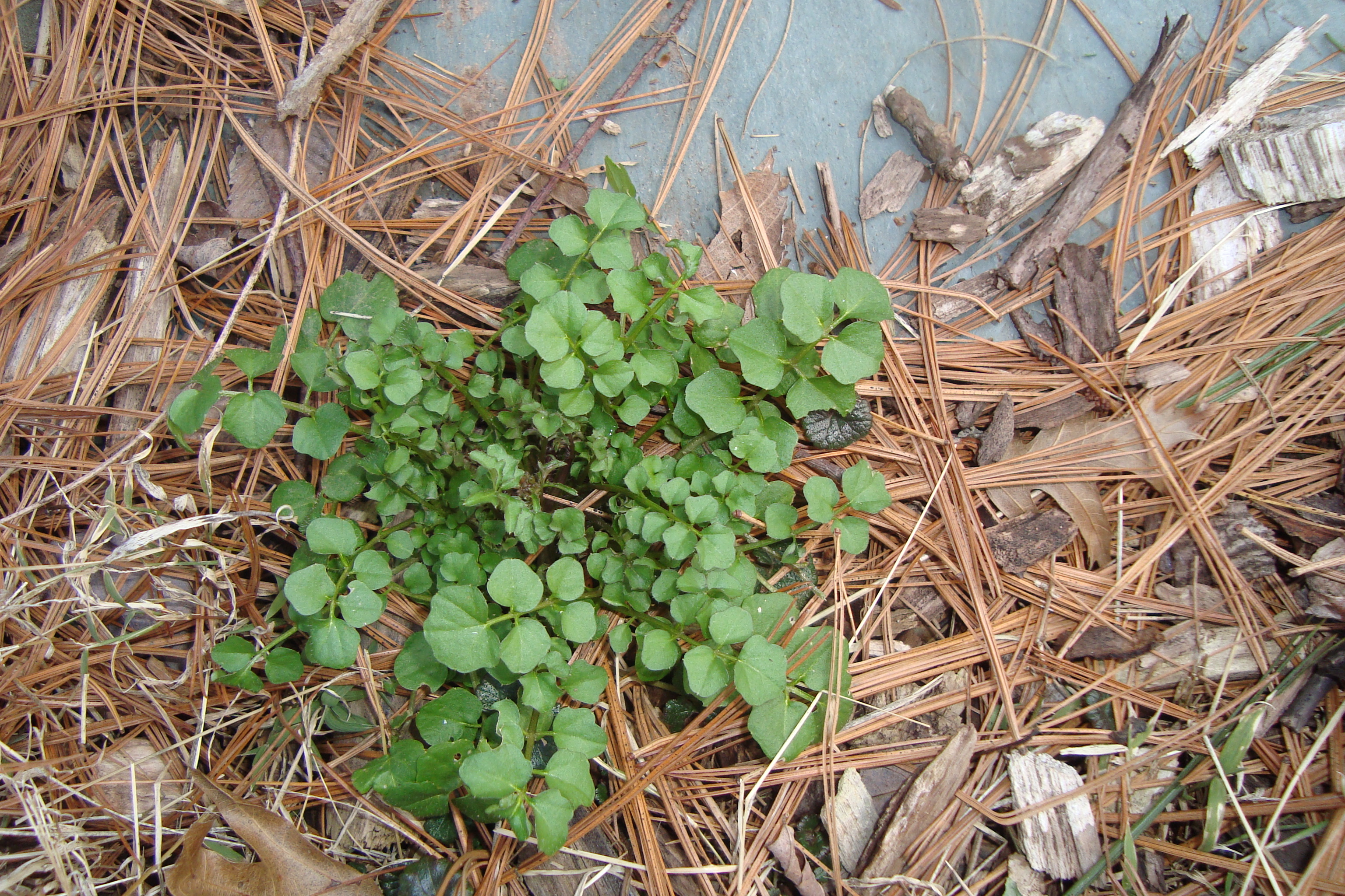 Upright or sprawling plant, up to 8″ tall. Leaves on long petioles, palmately compound with 3 heart-shaped leaflets. Each leaflet creased down the middle; edges are untoothed. Flowers are yellow, 5-petaled, radially symmetrical, about 1/2″ across, They bloom spring through summer. Fruits are upright green seedpods, up to 1″ long, on a sharp angle from the stem.